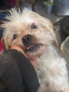 Bij binnenkomst was zijn vacht ernstig verwaarloosd, vol klitten. Hij is inmiddels geknipt en verzorgd, maar het verhaal daarachter is duidelijk: te weinig zorg, te weinig aandacht, te weinig liefde. Dat laat sporen na, zeker bij een hond als Bommel, die zo duidelijk gericht is op mensen.