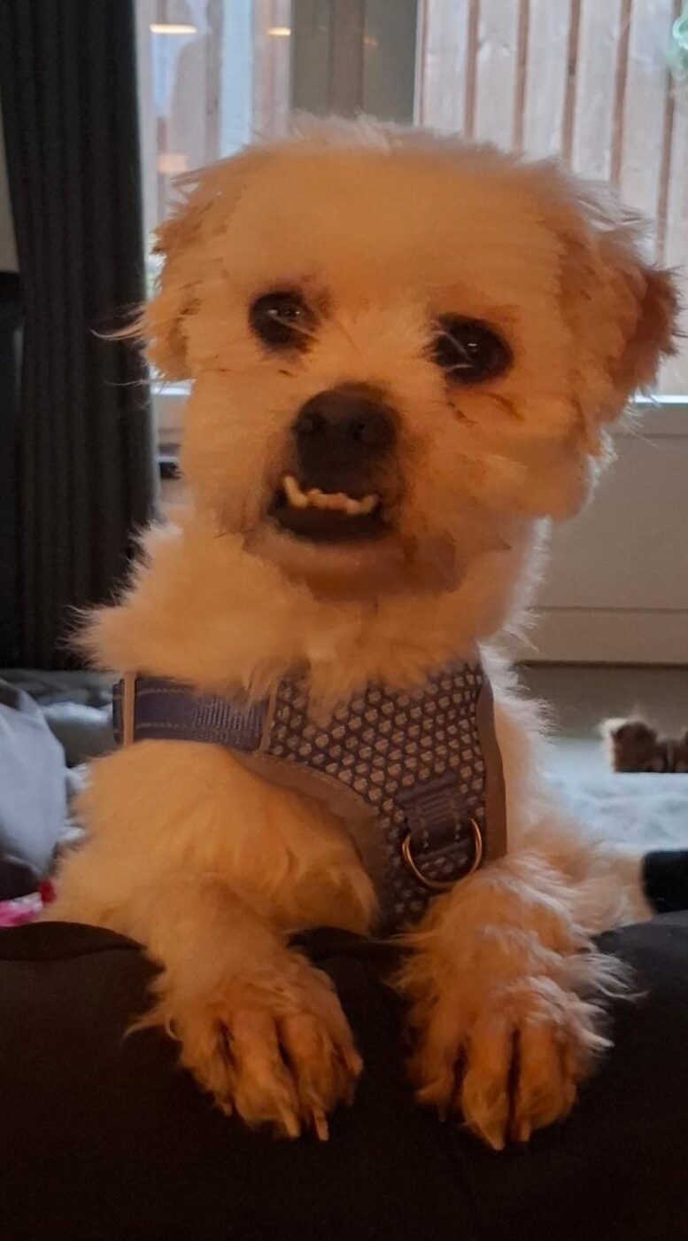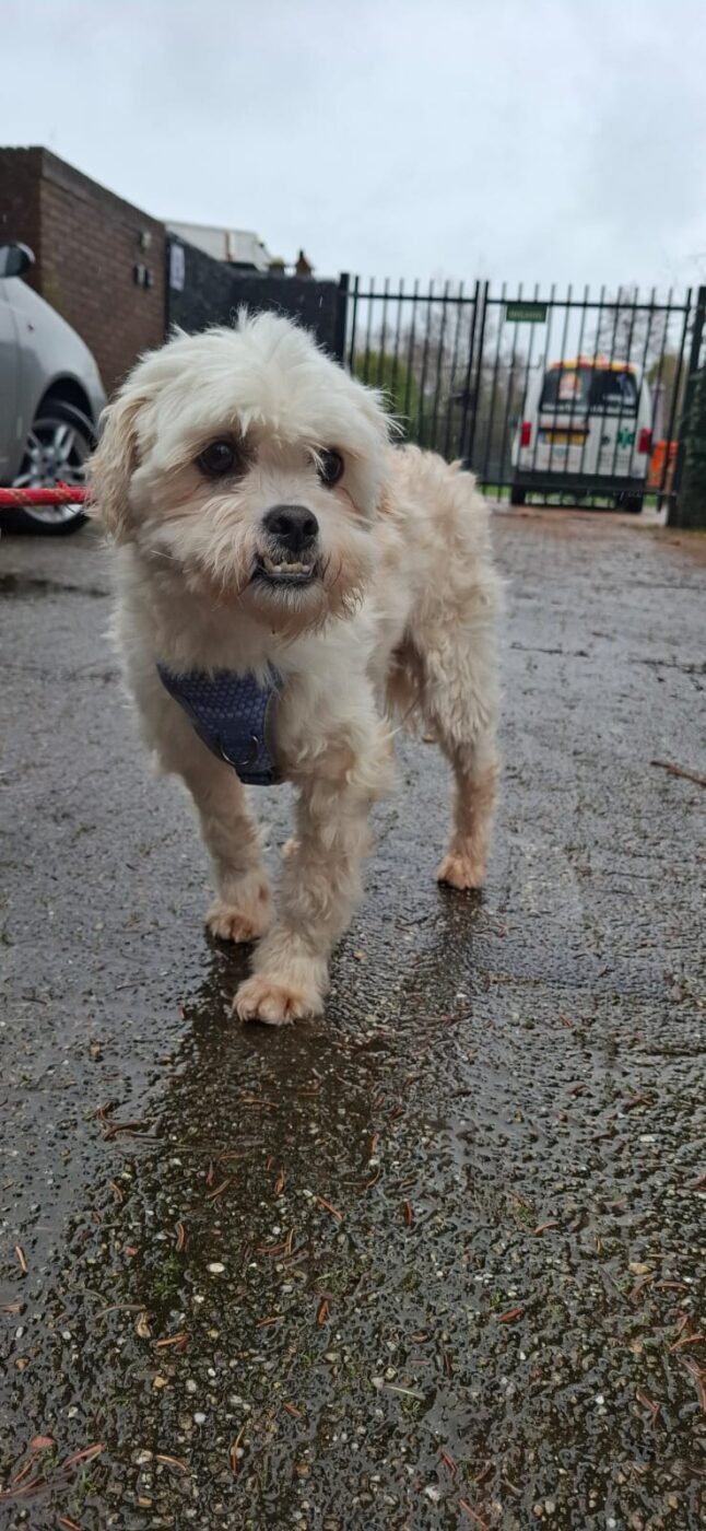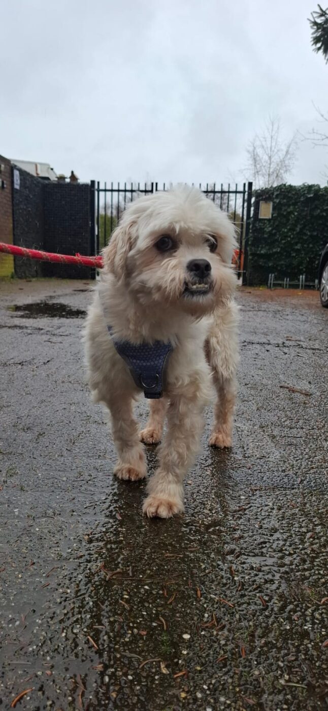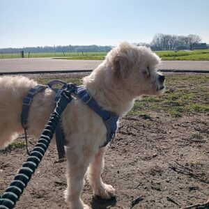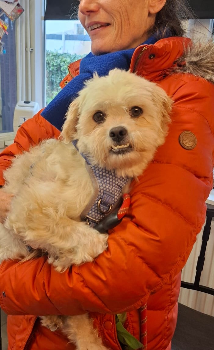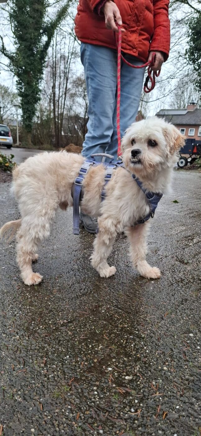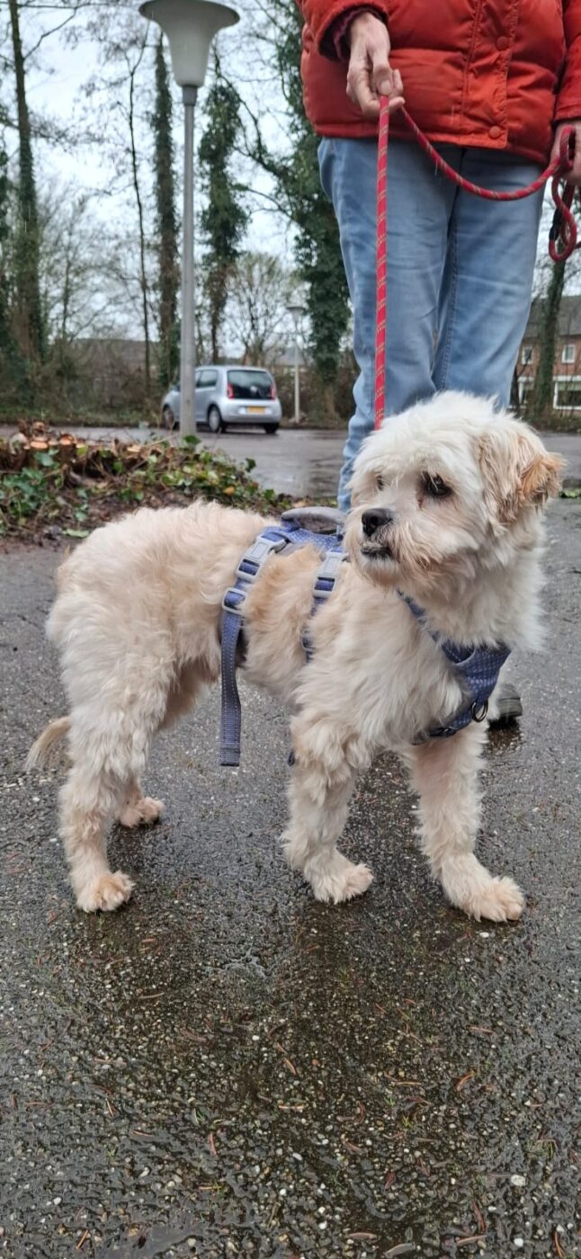 Bij binnenkomst was zijn vacht ernstig verwaarloosd, vol klitten. Hij is inmiddels geknipt en verzorgd, maar het verhaal daarachter is duidelijk: te weinig zorg, te weinig aandacht, te weinig liefde. Dat laat sporen na, zeker bij een hond als Bommel, die zo duidelijk gericht is op mensen.