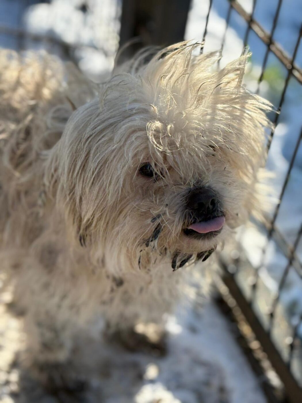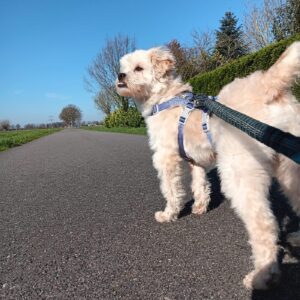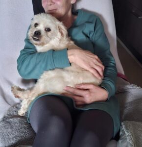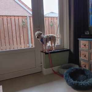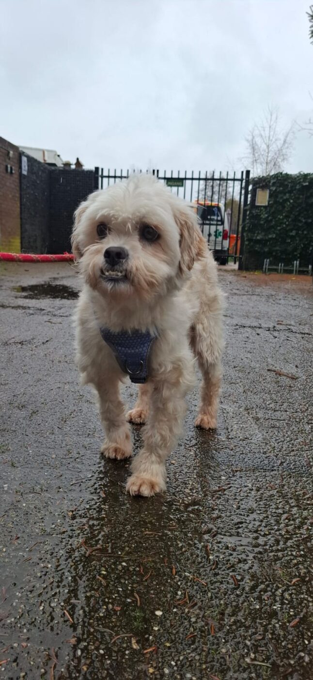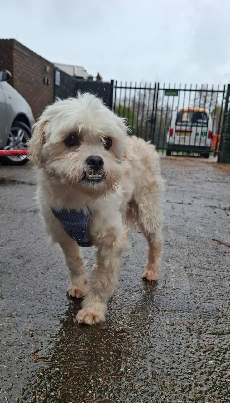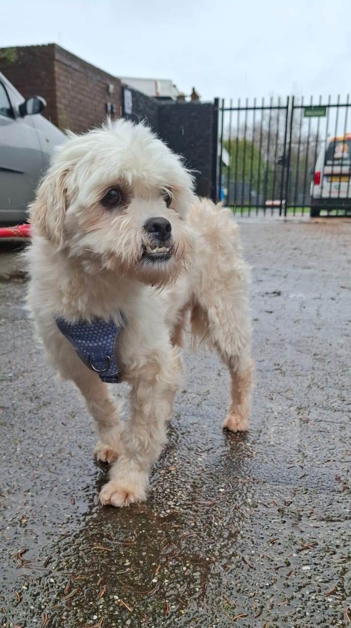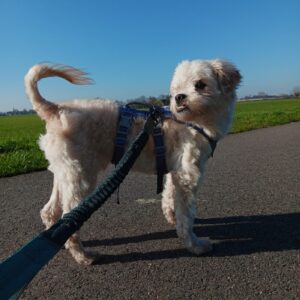 Bij binnenkomst was zijn vacht ernstig verwaarloosd, vol klitten. Hij is inmiddels geknipt en verzorgd, maar het verhaal daarachter is duidelijk: te weinig zorg, te weinig aandacht, te weinig liefde. Dat laat sporen na, zeker bij een hond als Bommel, die zo duidelijk gericht is op mensen.