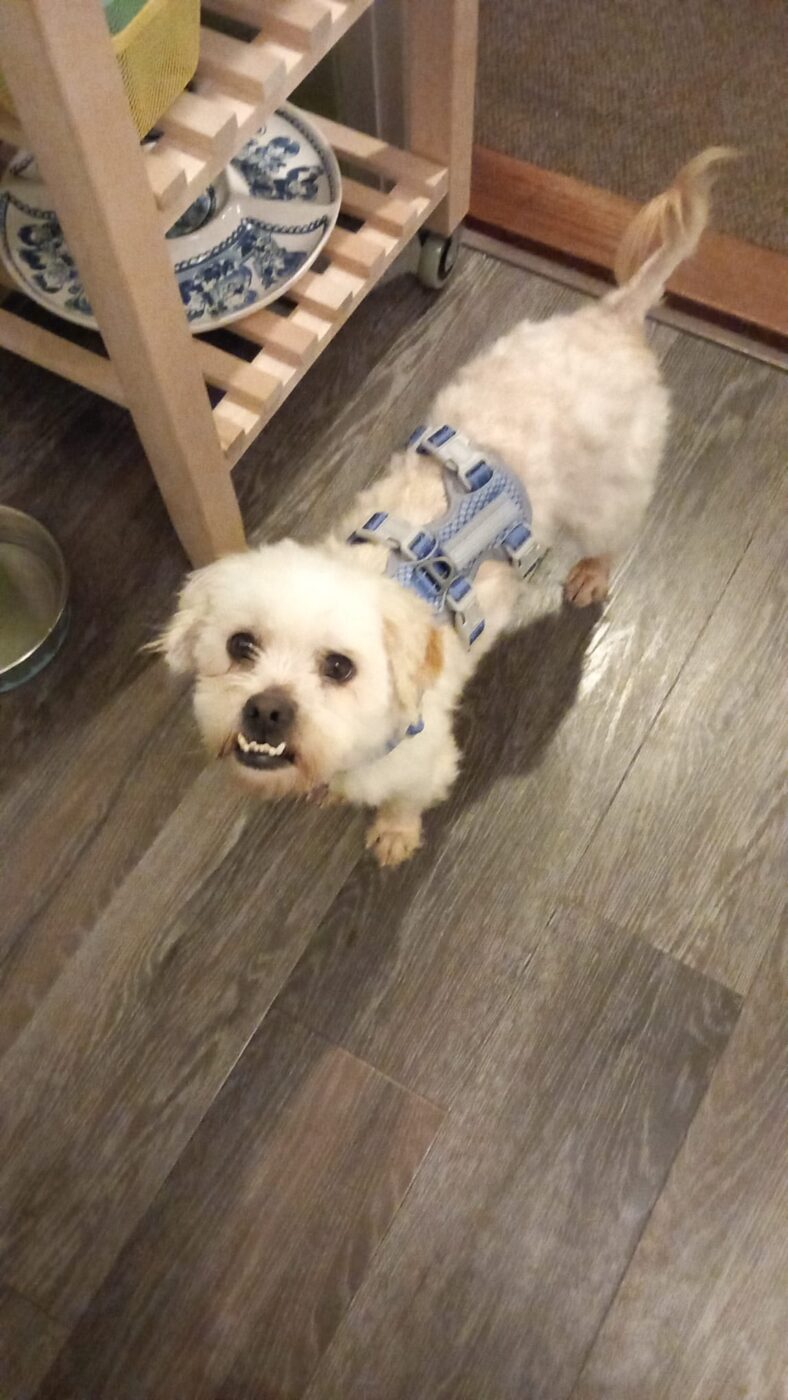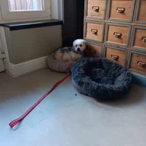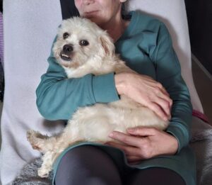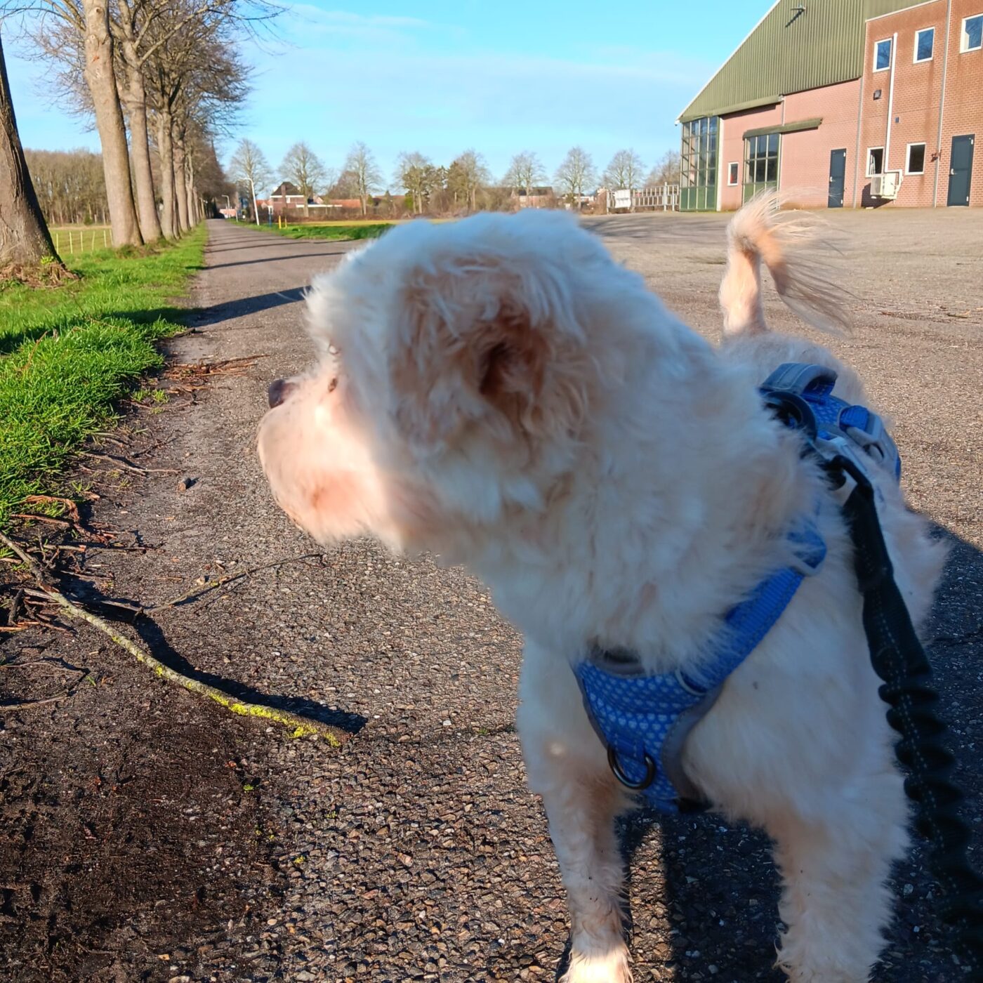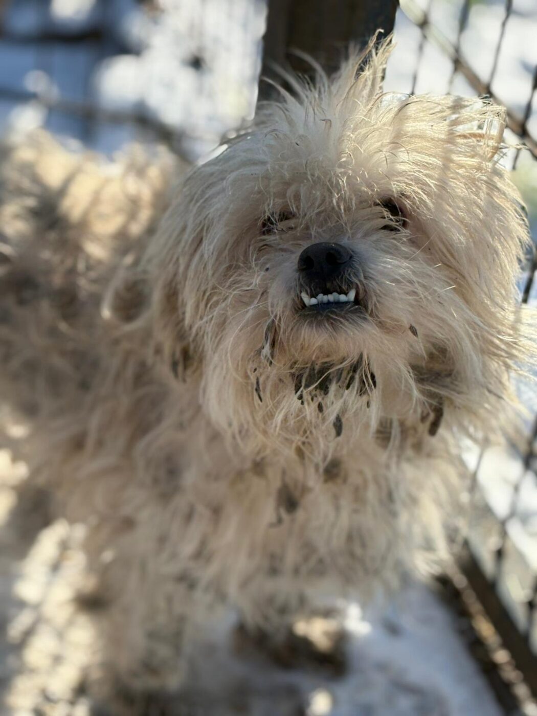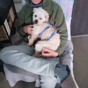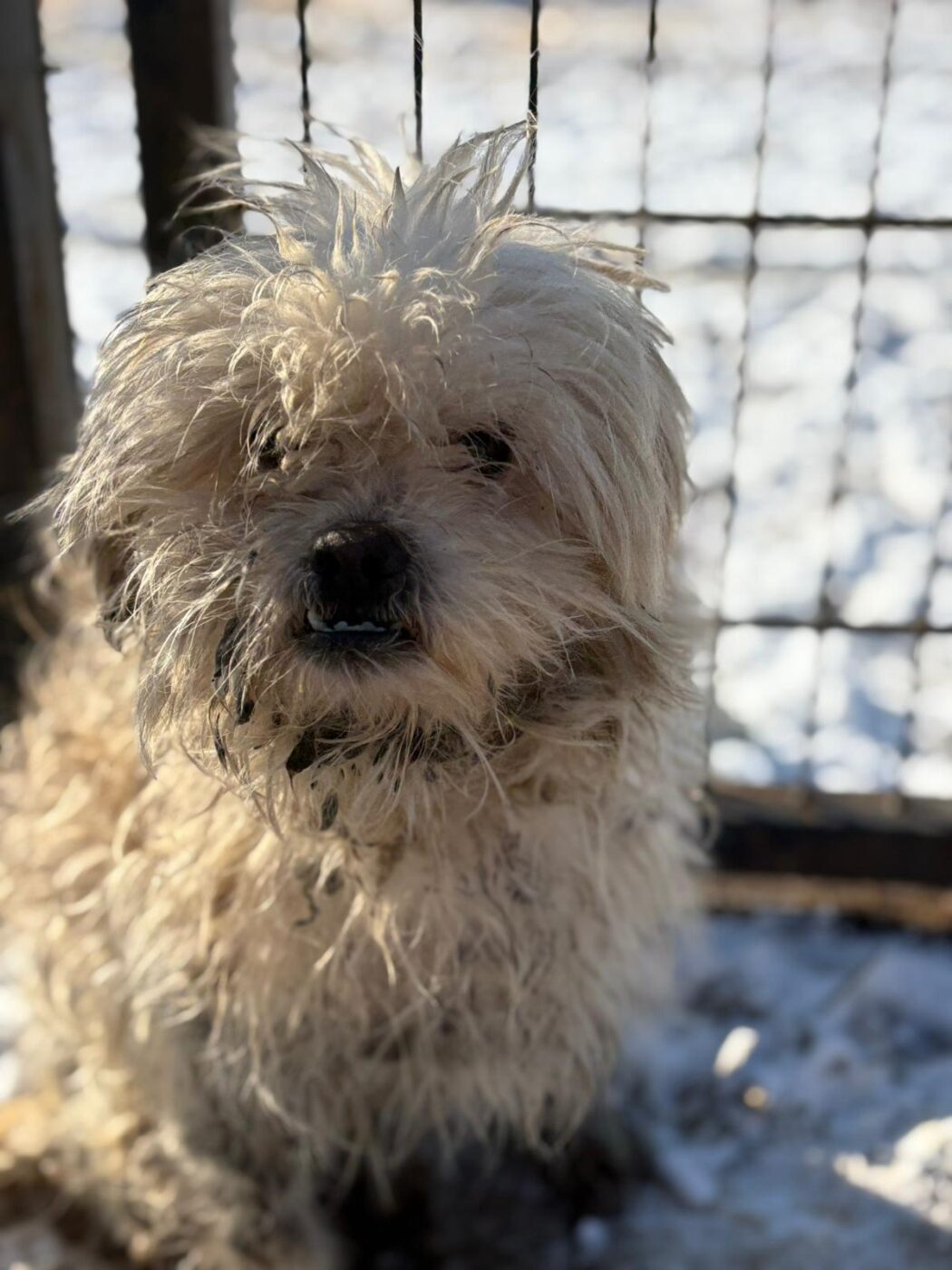Bij binnenkomst was zijn vacht ernstig verwaarloosd, vol klitten. Hij is inmiddels geknipt en verzorgd, maar het verhaal daarachter is duidelijk: te weinig zorg, te weinig aandacht, te weinig liefde. Dat laat sporen na, zeker bij een hond als Bommel, die zo duidelijk gericht is op mensen.