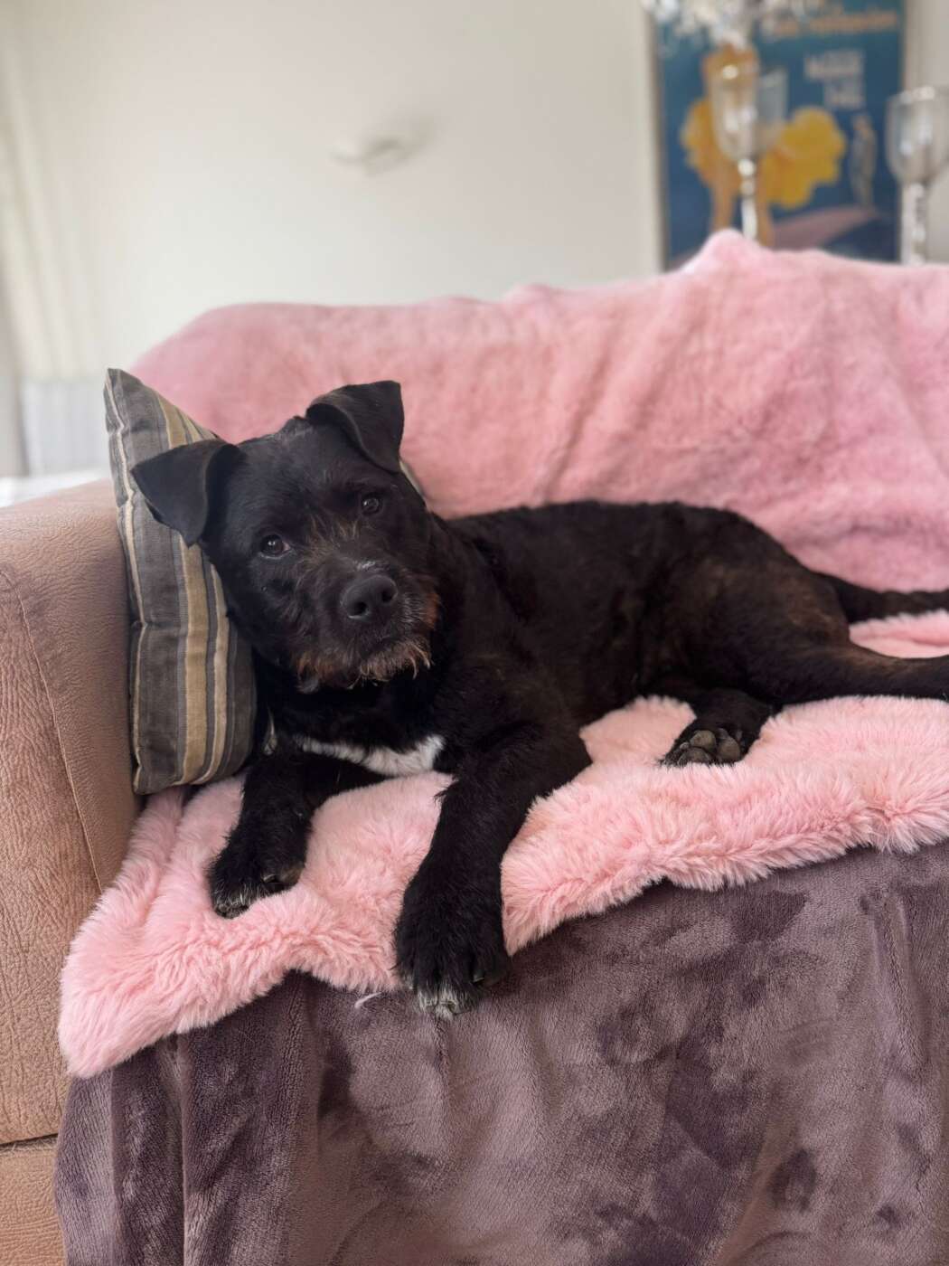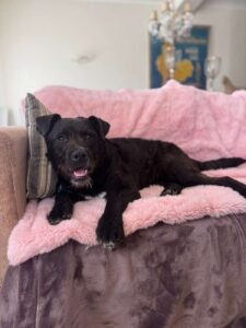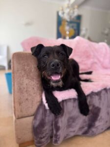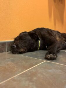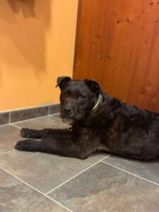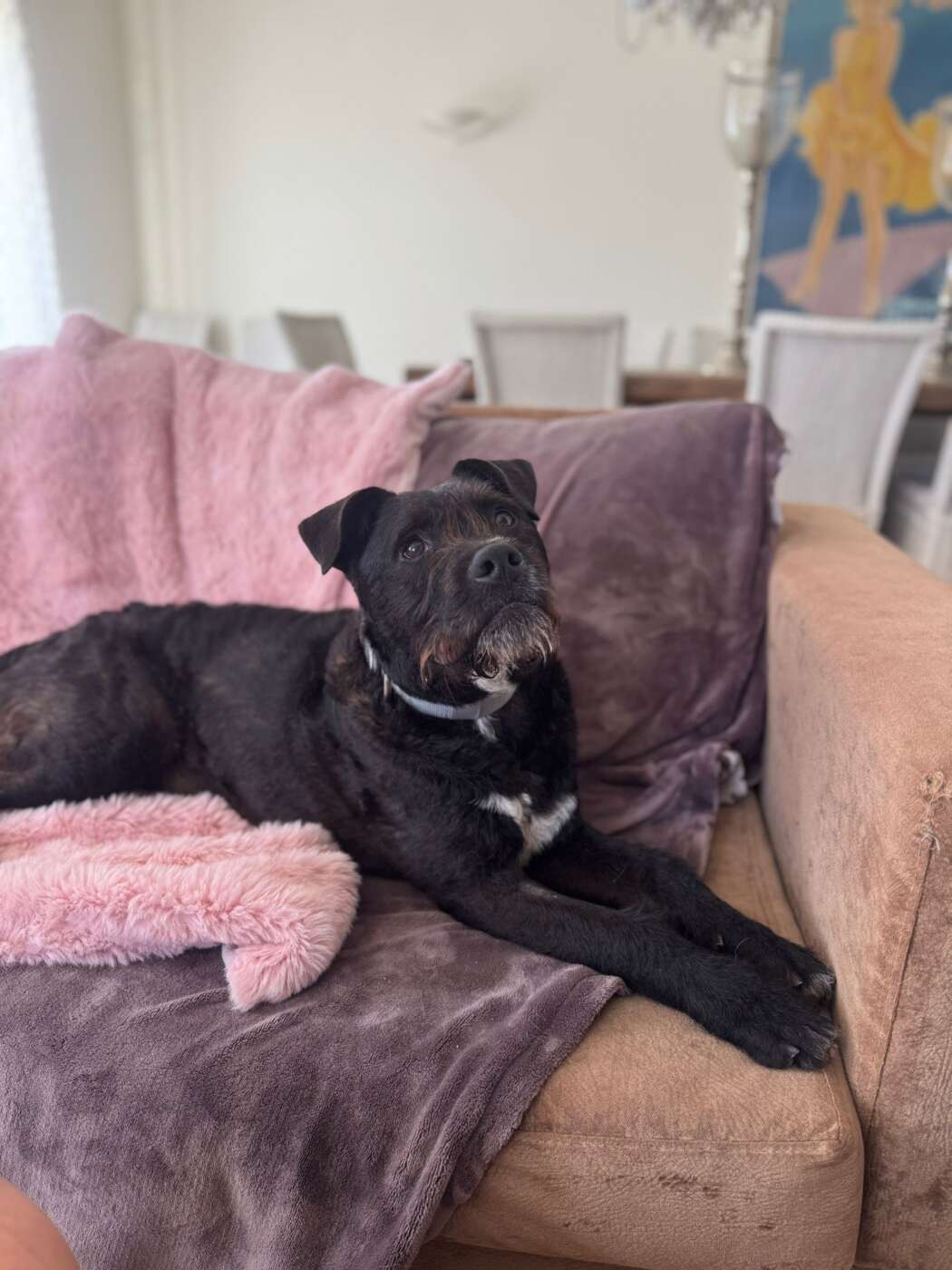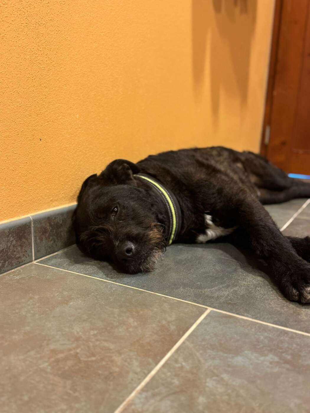 Aan de lijn kan hij nog wat enthousiast zijn, maar dat is niet gek voor een jonge hond die nog veel moet ontdekken. Met de juiste begeleiding gaat hij daar zeker stappen in maken. Zijn vacht is bijzonder: zwart van boven, maar met bruine ondertonen, wat hem een warme uitstraling geeft. Stevig, wat ruig en licht golvend, met een grappig baardje en oortjes die nét iets te klein lijken voor zijn kop.