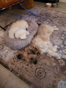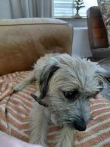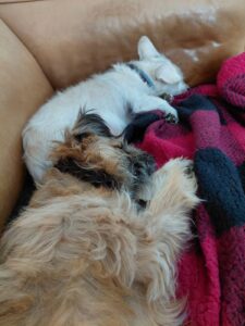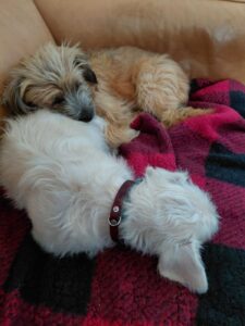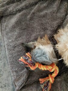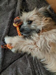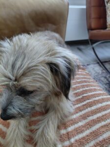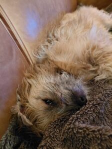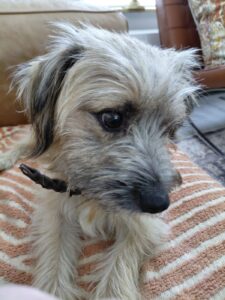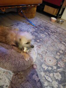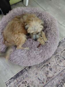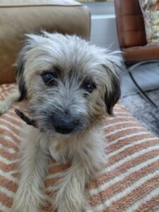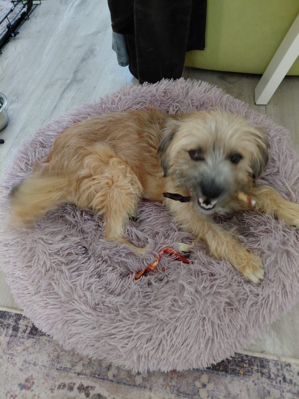 Binnen is Ollie aanhankelijk en zoekt hij graag contact. Hij kruipt het liefst dicht bij je, geniet van een aai of een knuffel en bewaart zijn speeltjes en kauwbotten netjes in zijn eigen mand. Naar andere honden en mensen is hij over het algemeen vriendelijk en rustig. Soms reageert hij nog wat onzeker in onbekende situaties, maar dat is puur spanning — met wat geduld en duidelijke begeleiding zal dat verder verbeteren.