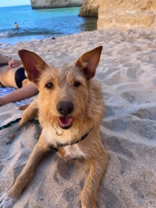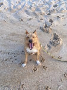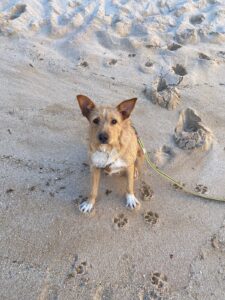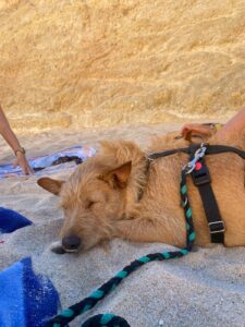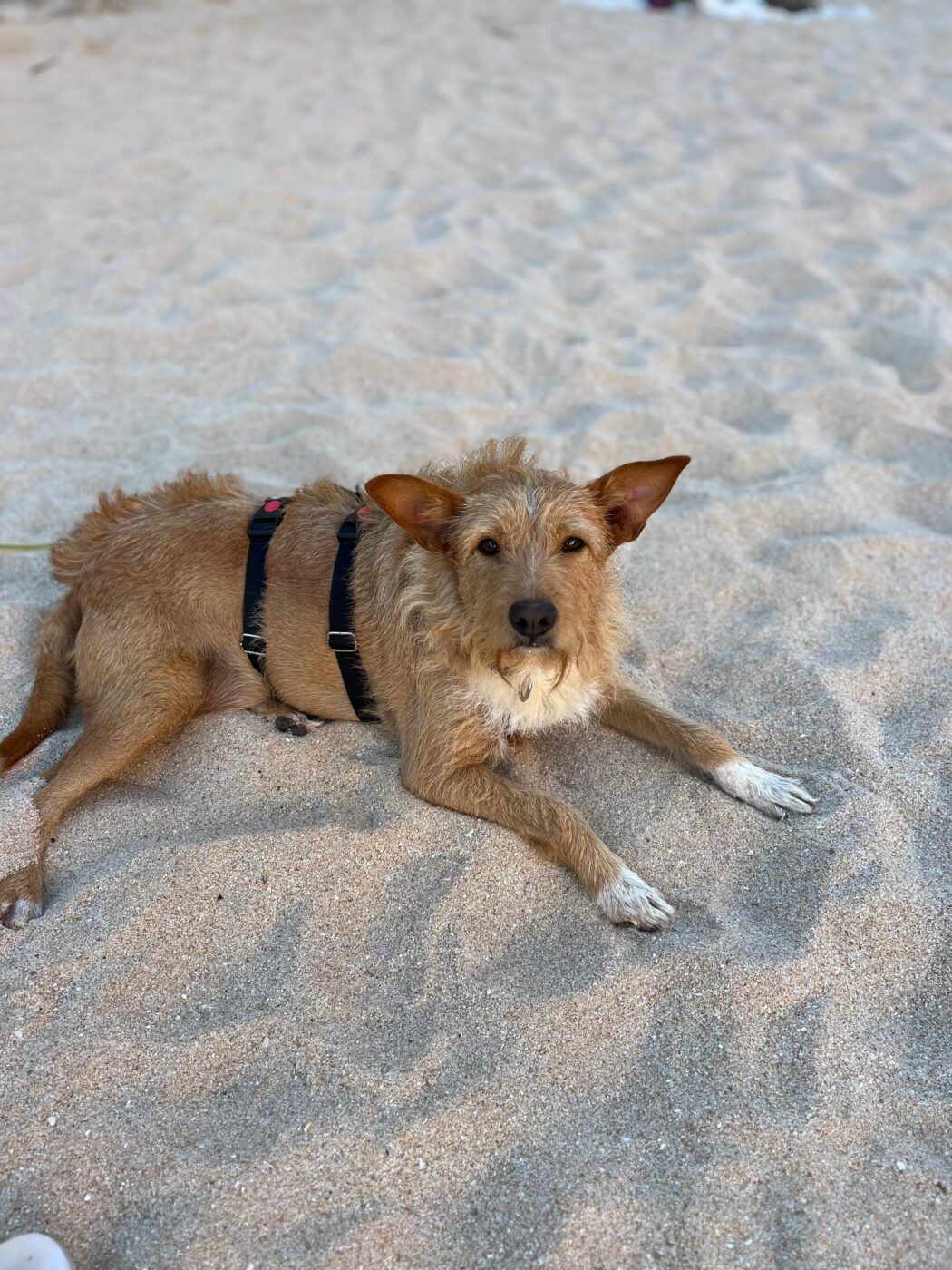 Hoewel hij de zee nog een beetje spannend vond, was hij wél nieuwsgierig naar alles om hem heen. En het mooiste moment? Zodra zijn vrijwilliger in het zand ging liggen, kwam Danilo erbij, legde zich rustig neer en viel tevreden in slaap. Een ontspannen, zacht karakter dat je hart direct verovert.