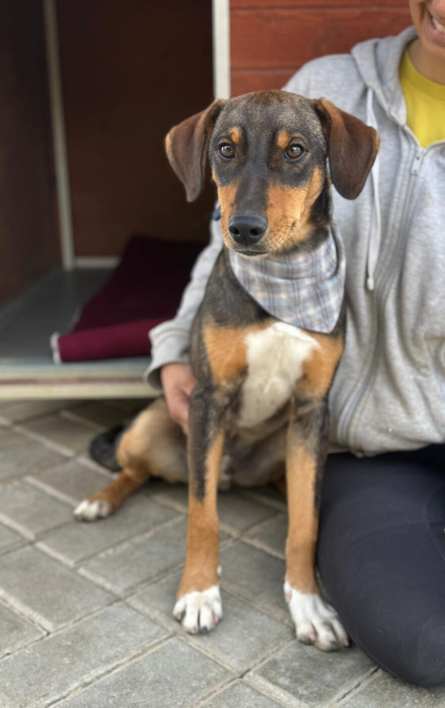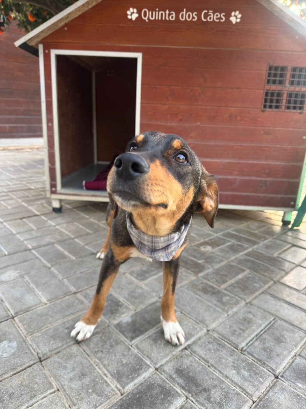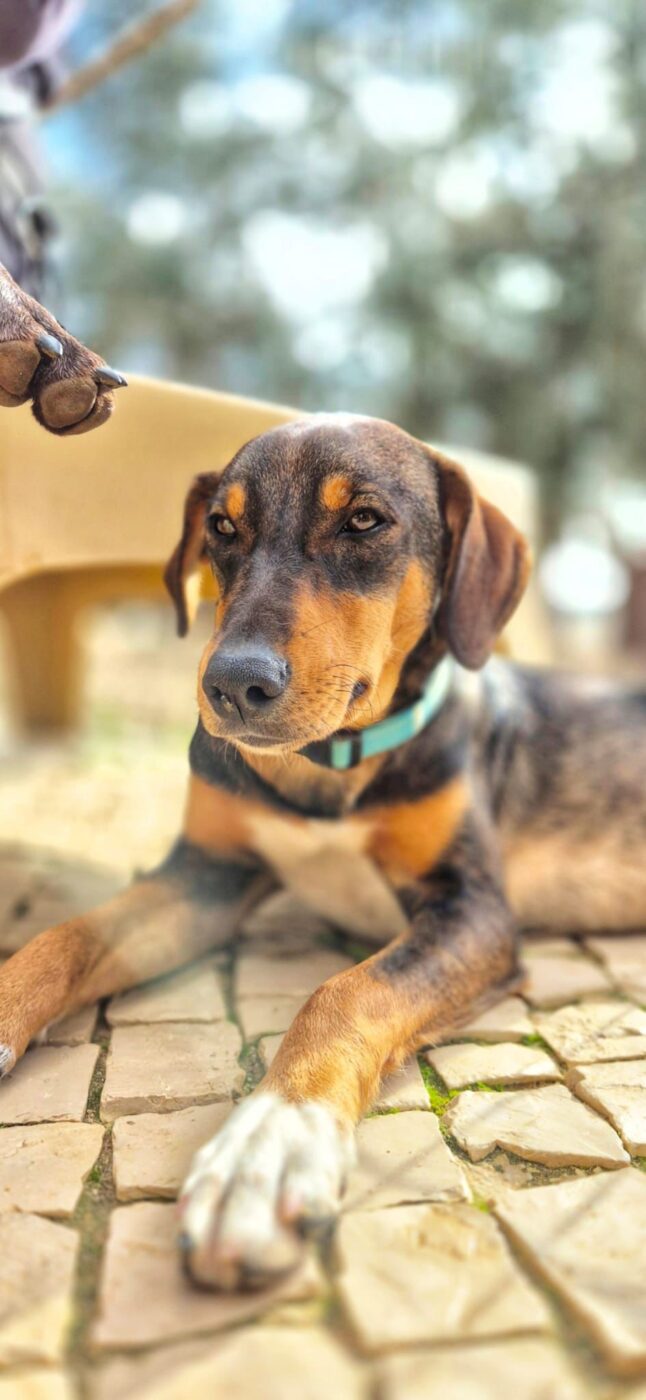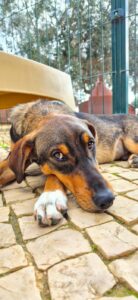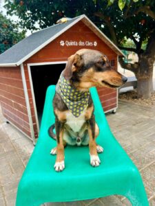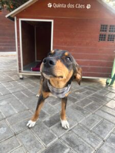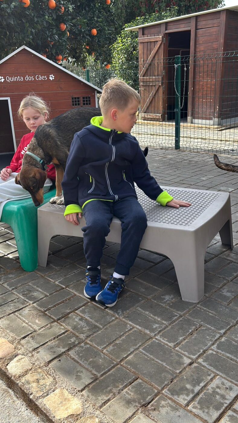 Deze knul heet Ernie, één van de twee broertjes die samen uit het staatsasiel in Portugal zijn gekomen. Daar zat hij vol energie maar had hij nauwelijks ruimte om echt hond te kunnen zijn. Sinds zijn aankomst op de Quinta zie je hem letterlijk opbloeien: hij geniet van de vrijheid, het bewegen, spelen en gewoon weer even écht leven.