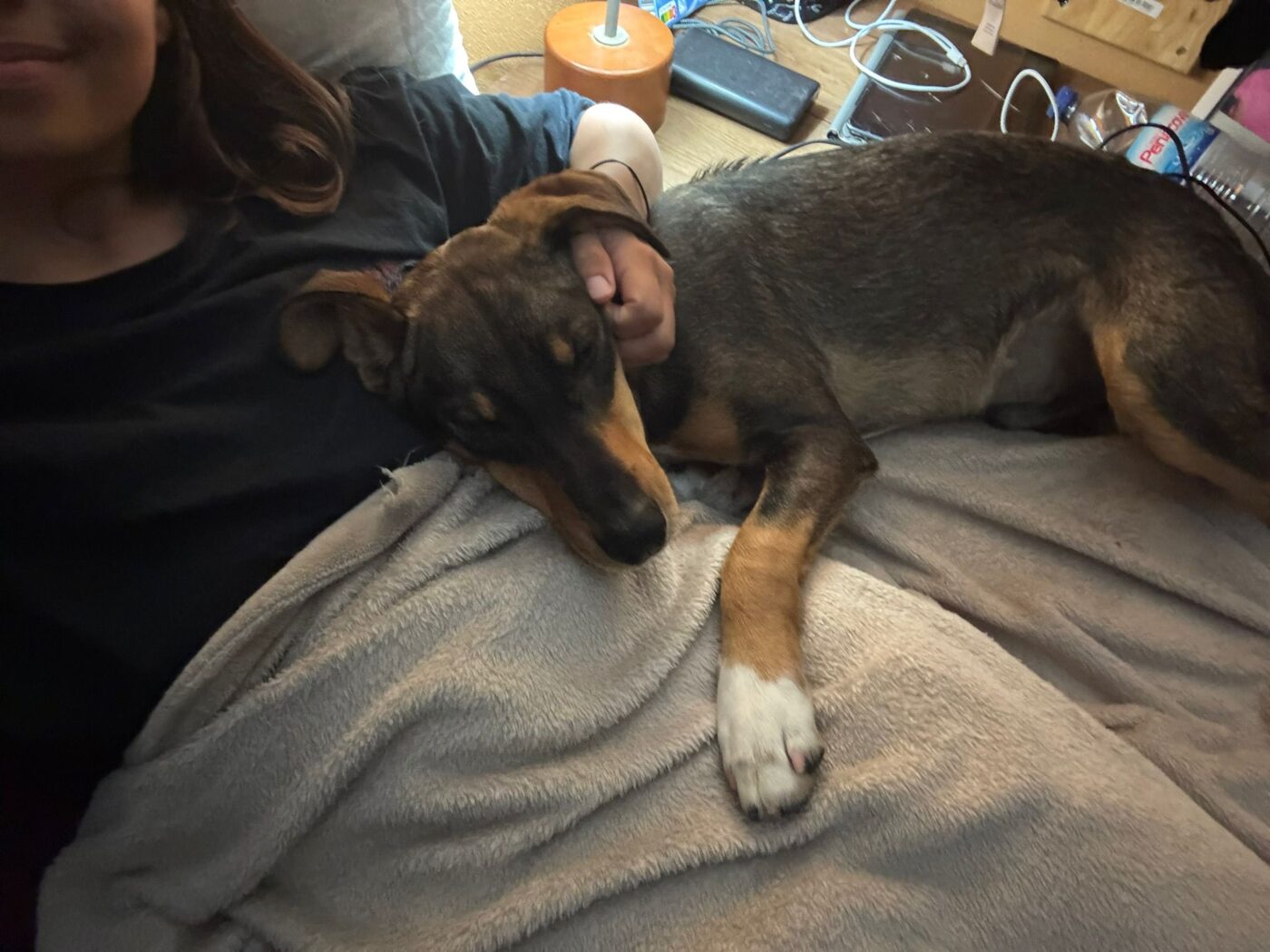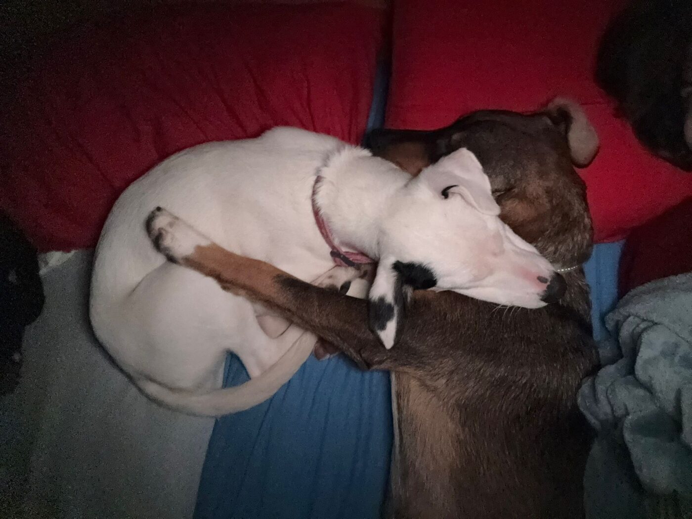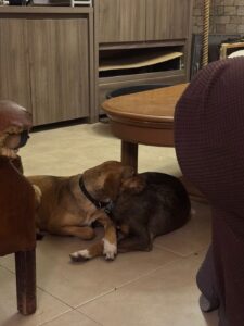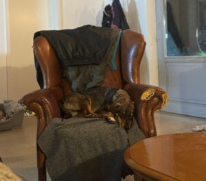 Ernie heeft inmiddels ook in het vrijwilligershuis gelogeerd, zowel samen met zijn broer als alleen. Dat ging uitstekend. Binnen is hij rustig en prettig aanwezig. De eerste avond was hij nog nieuwsgierig naar wat er zoal op de eettafel gebeurde, maar hij pakte de grenzen snel op en deed het daarna perfect. ’s Avonds ligt hij ontspannen in de woonkamer en ’s nachts slaapt hij gewoon door zonder ongelukjes in huis. Hij vindt het fijn om dicht bij zijn mens te liggen; knuffelmomenten zijn voor hem echt waardevol.