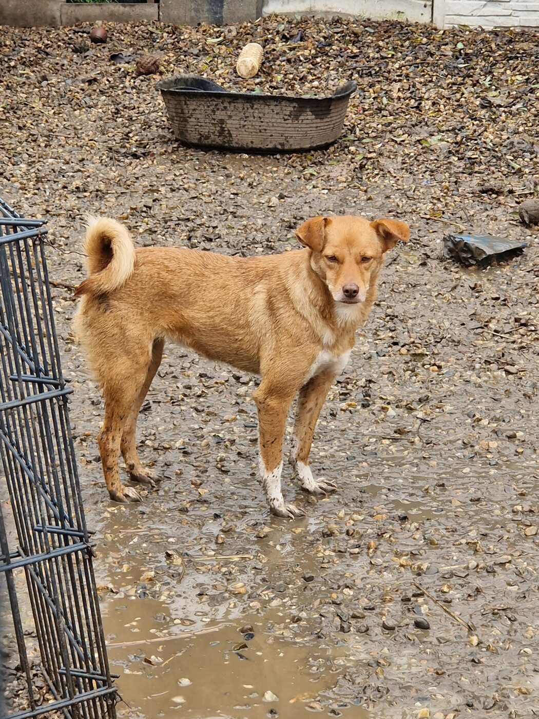 Fanny is een gesteriliseerd teefje met een geschatte geboortedatum 22 oktober 2023, en ze is ongeveer 40cm hoog. (5-25)