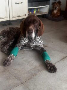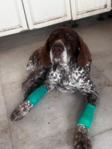 Finn werd in Roemenië gevonden bij een benzinestation, waar hij al een tijd rondzwierf met open wonden aan beide voorpoten. Niemand greep in, tot onze partnerrescue hem meenam en de nodige zorg gaf die hij zo hard nodig had. De wonden waren diep — echte vleeswonden — maar inmiddels zijn ze mooi genezen en loopt Finn weer zonder moeite.