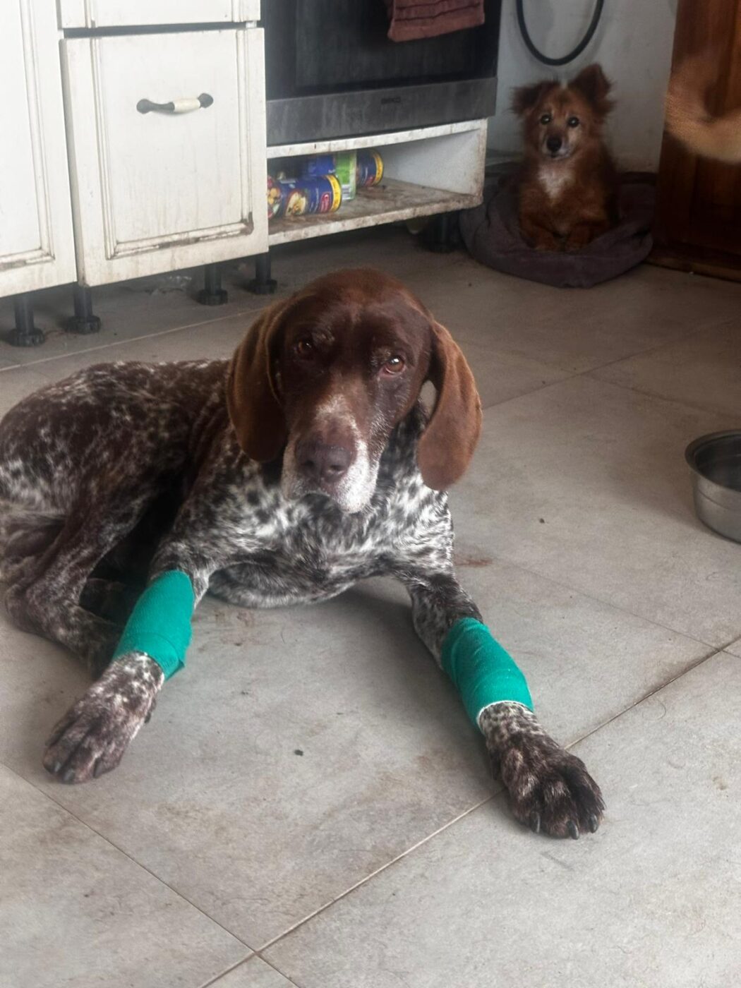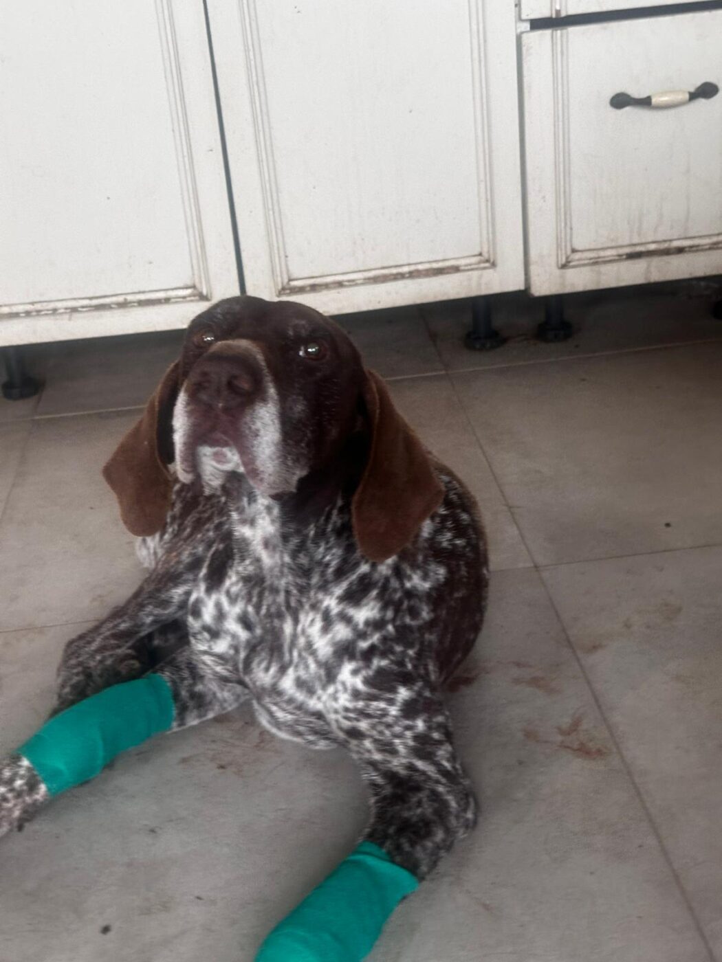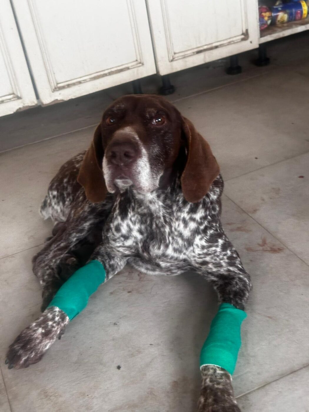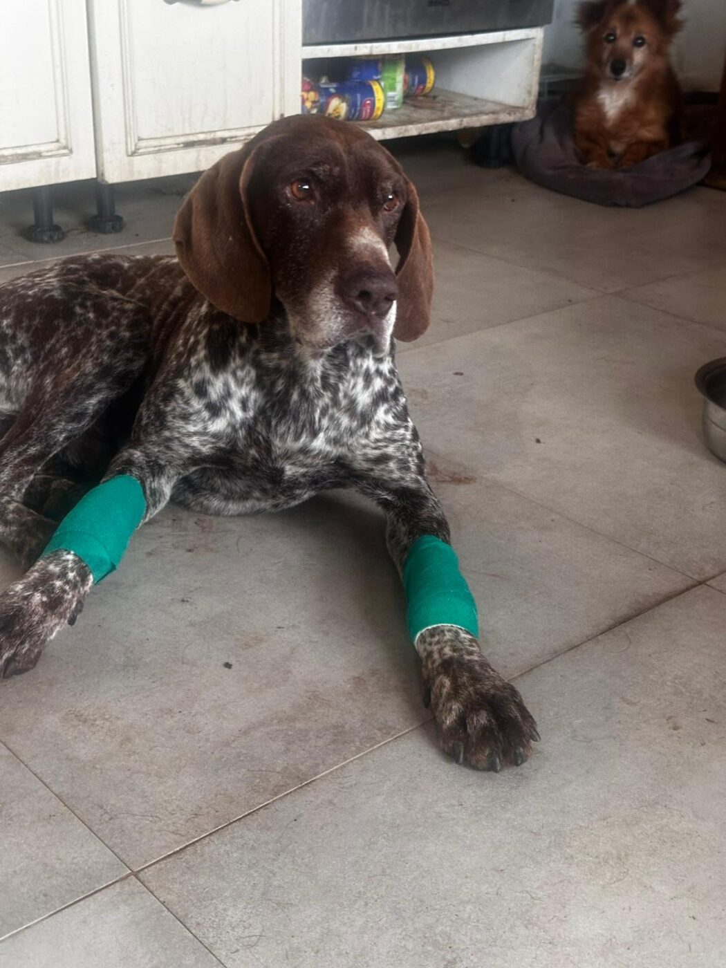 Finn werd in Roemenië gevonden bij een benzinestation, waar hij al een tijd rondzwierf met open wonden aan beide voorpoten. Niemand greep in, tot onze partnerrescue hem meenam en de nodige zorg gaf die hij zo hard nodig had. De wonden waren diep — echte vleeswonden — maar inmiddels zijn ze mooi genezen en loopt Finn weer zonder moeite.