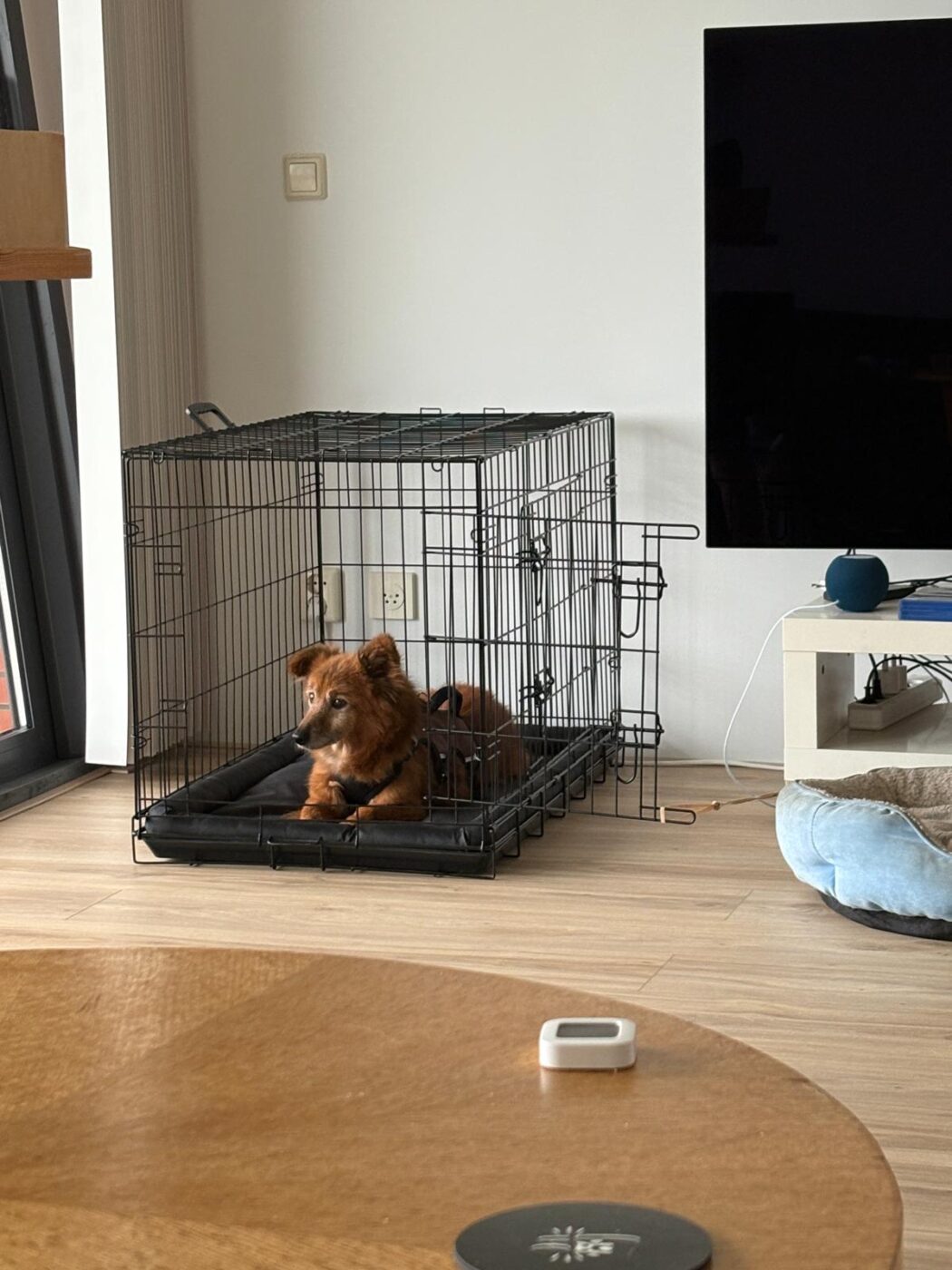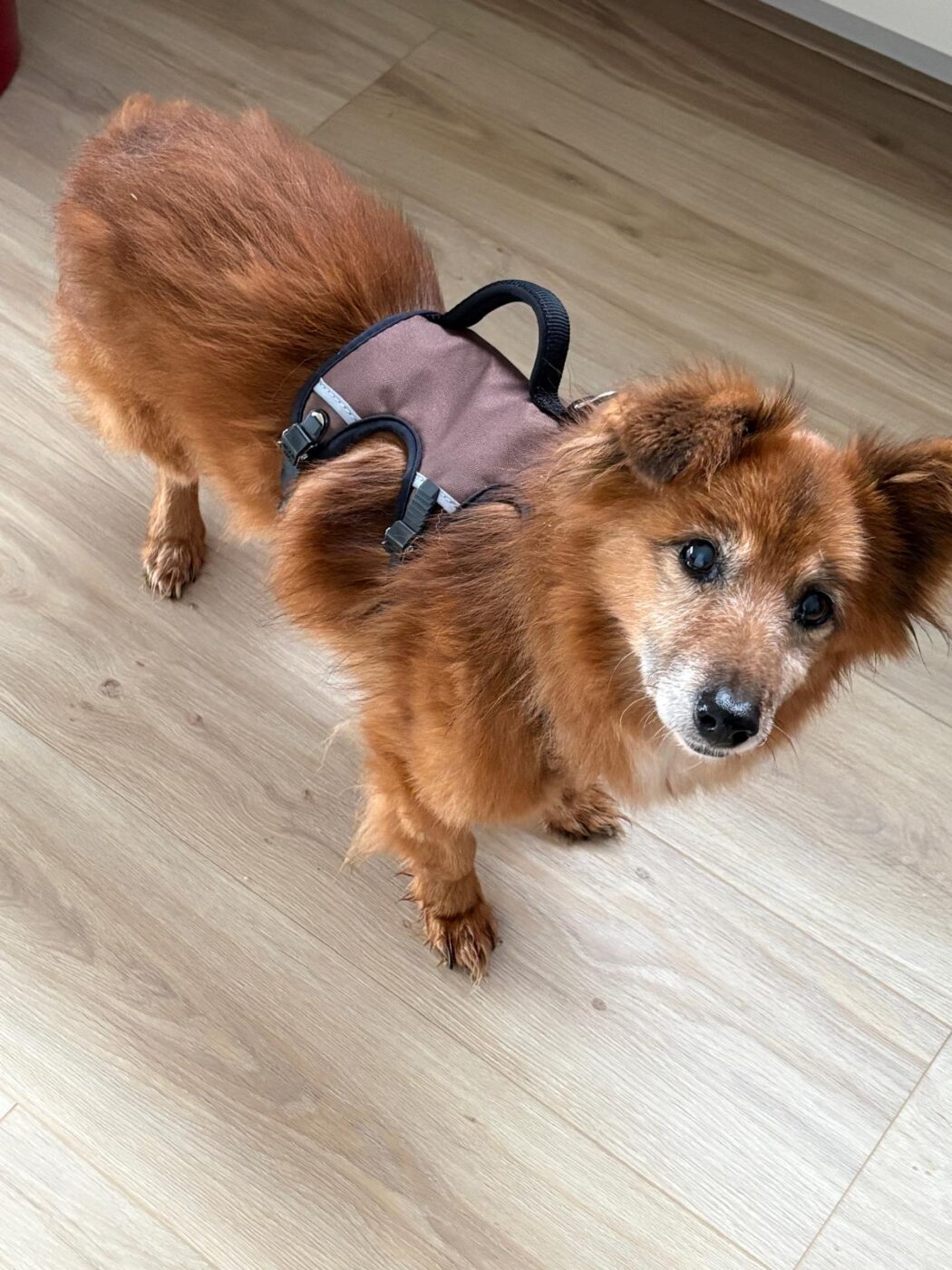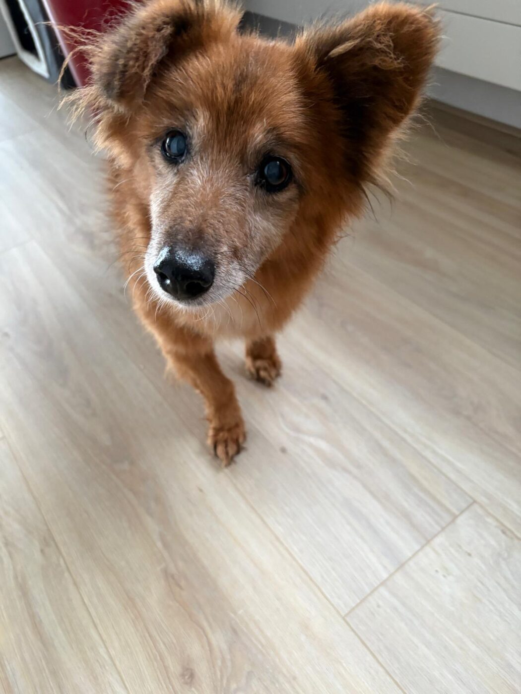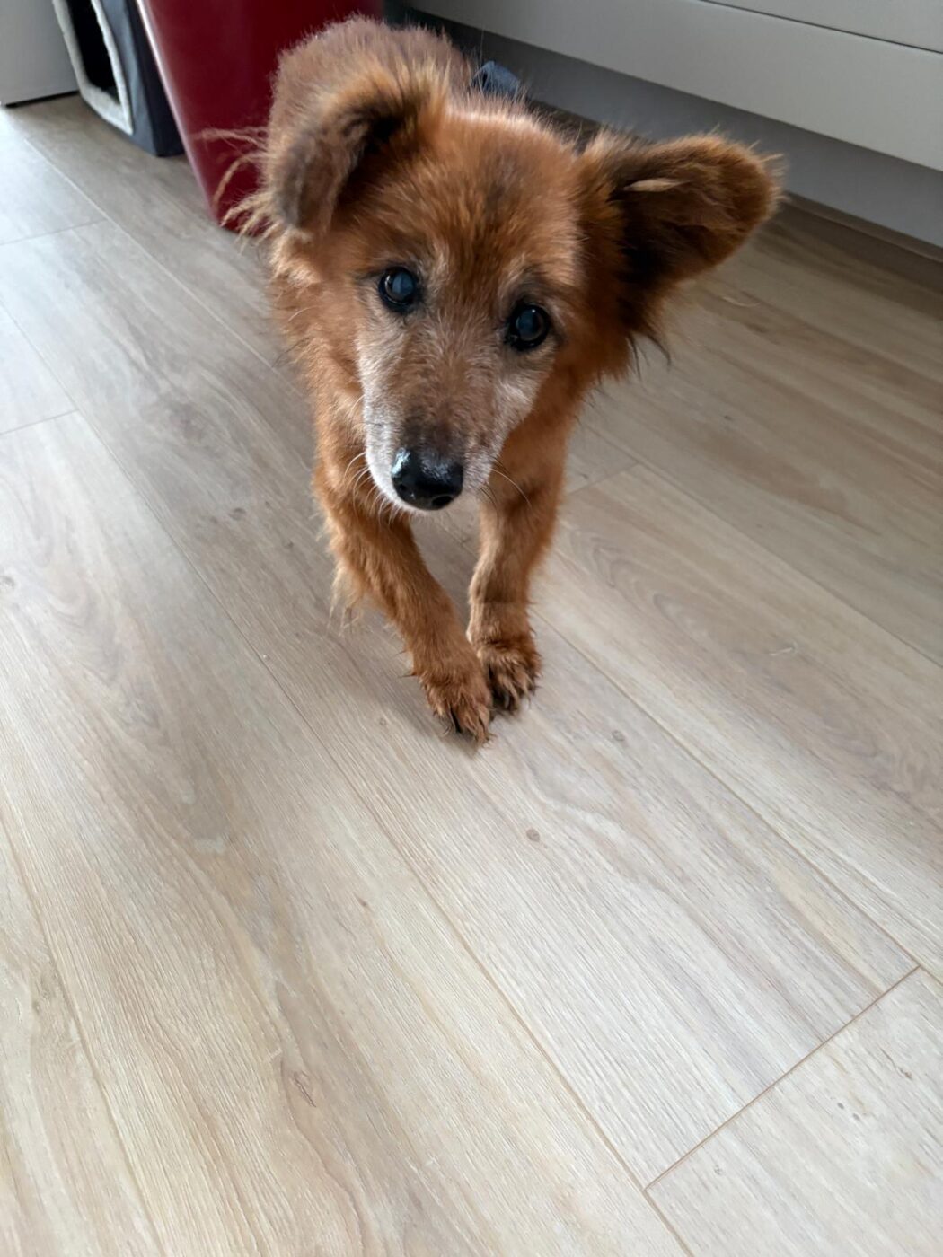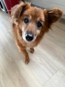 Fonzie liep al een tijd rond op straat in een klein dorpje. Zo’n hondje dat iedereen wel eens ziet, maar waar niemand echt naar omkijkt. Tot het op een dag zichtbaar misging. Hij was op, verzwakt, en iemand uit de buurt besloot Mirela te bellen. Zij is hem gaan halen. Gelukkig, want veel langer had hij het daar niet volgehouden.
