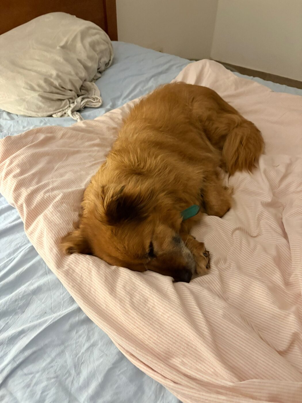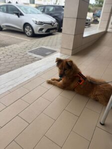 ’s Ochtends stond hij met echte blijheid klaar voor een wandeling; dat blijft zijn favoriete moment van de dag. Hij heeft geen enkele keer gegromd of een poging tot happen gedaan. Zijn tuig aandoen gaat perfect, alleen zijn halsband blijft een gevoelig puntje.