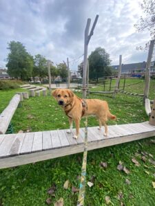 Twee keer per week gaat Guus mee met zijn vaste uitlaatservice, en dat zijn echte hoogtepunten voor hem. Hij geniet van kleine uitdagingen, over een houten balk lopen, van rots naar rots springen, rustig blijven zitten voor een beloning, hij doet het allemaal met zichtbaar plezier en trots.