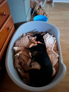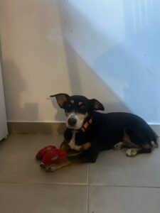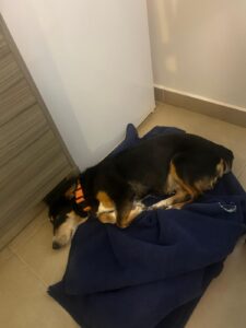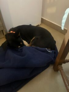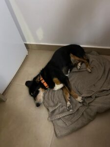 Daar heeft ze haar eigen favoriete plekje uitgekozen – vlak voor de koelkast. In de eerste weken bleef ze daar de hele tijd liggen, maar inmiddels wandelt ze door de kamer, gaat naar de waterbak en verkent nieuwsgierig haar omgeving. Met de andere honden in huis gaat het goed; ze bewaakt haar eigen mandje, maar zonder ooit agressief te zijn.
