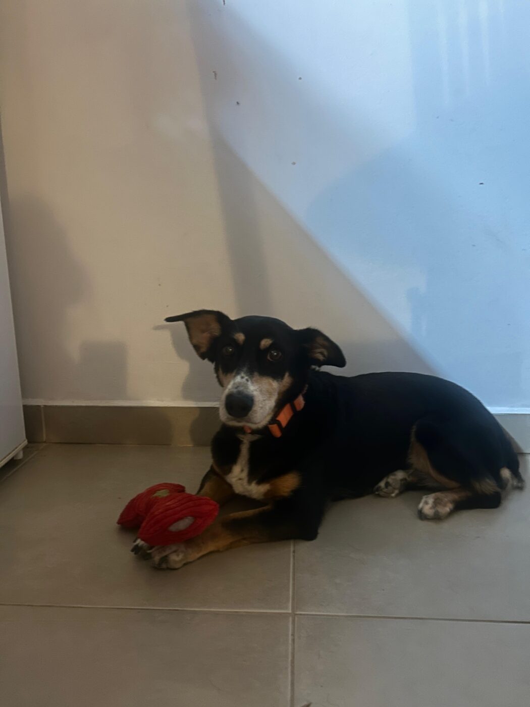 Daar heeft ze haar eigen favoriete plekje uitgekozen – vlak voor de koelkast. In de eerste weken bleef ze daar de hele tijd liggen, maar inmiddels wandelt ze door de kamer, gaat naar de waterbak en verkent nieuwsgierig haar omgeving. Met de andere honden in huis gaat het goed; ze bewaakt haar eigen mandje, maar zonder ooit agressief te zijn.