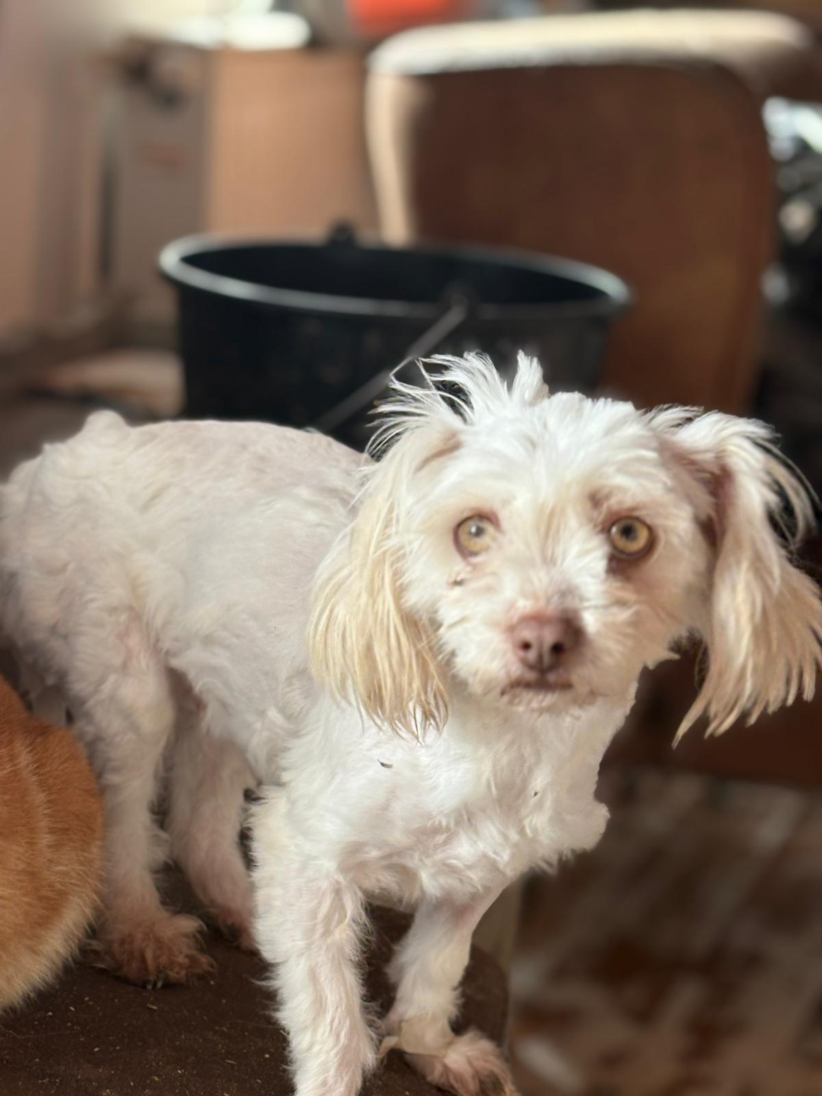 Ze zat haar hele leven opgesloten in een schuur. Geen ruimte, geen aandacht, geen veiligheid. Gewoon overleven. Ze was zwaar verwaarloosd toen ze daar werd weggehaald. Haar vacht was in zo’n slechte staat dat ze geknipt moest worden. Dat groeit weer aan en daaronder zit een prachtig wit, knap meisje.
