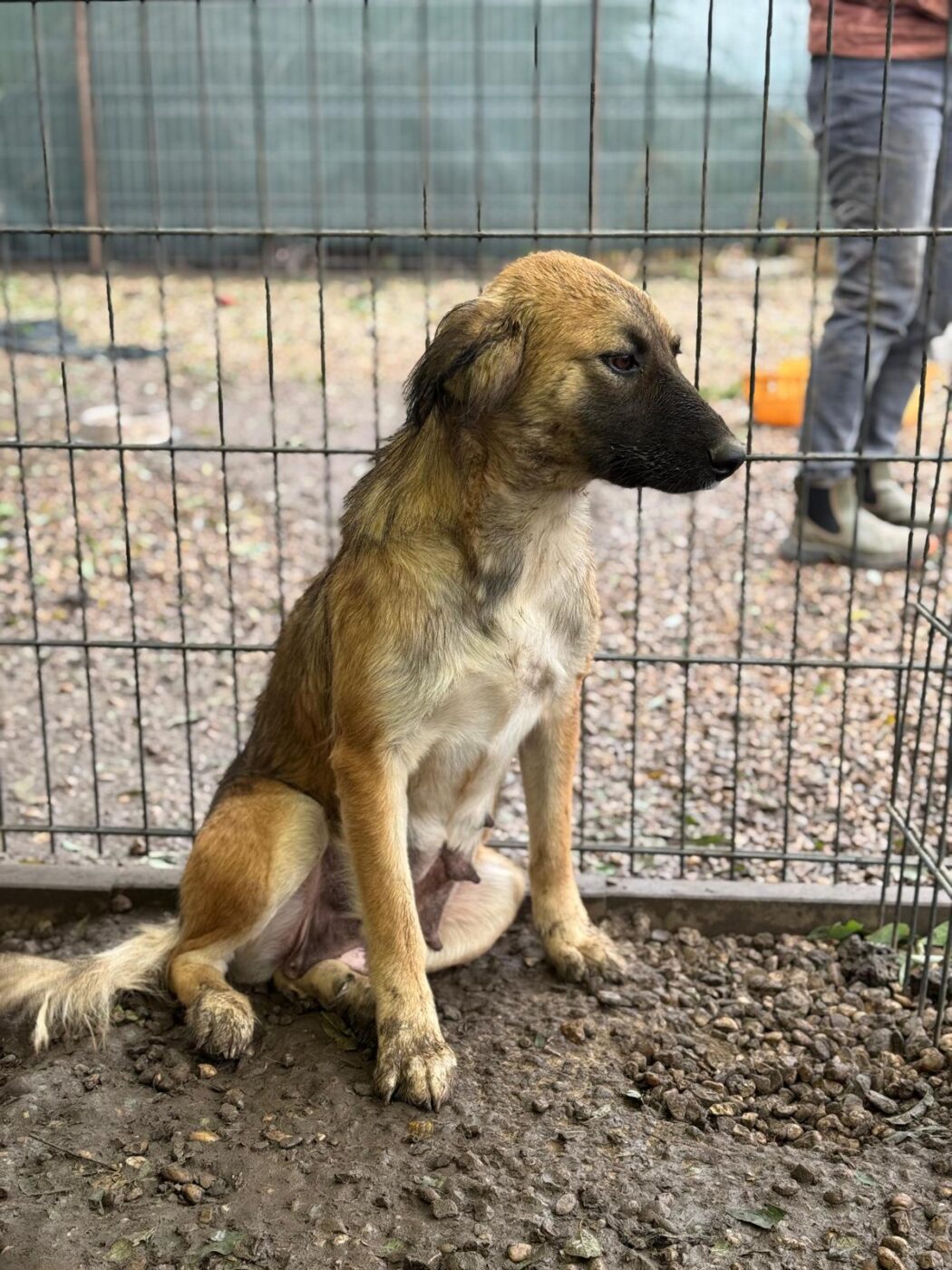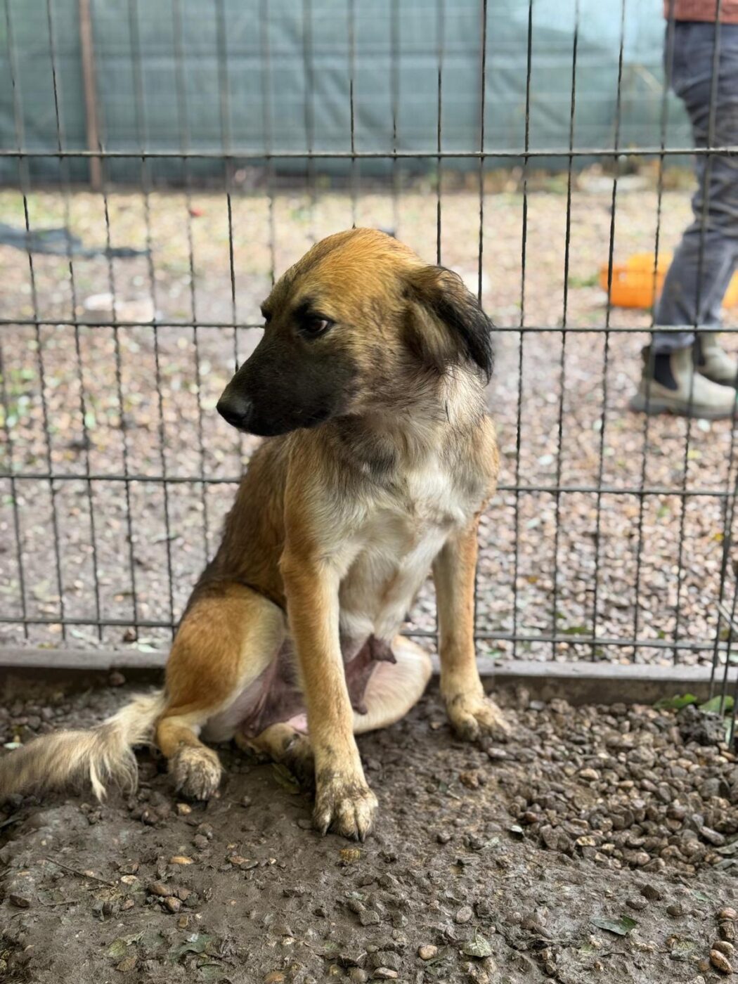 Meisje is een gesteriliseerde teef met een geschatte geboortedatum van 12 augustus 2022 en ze is circa 50 centimeter groot. (10-25)