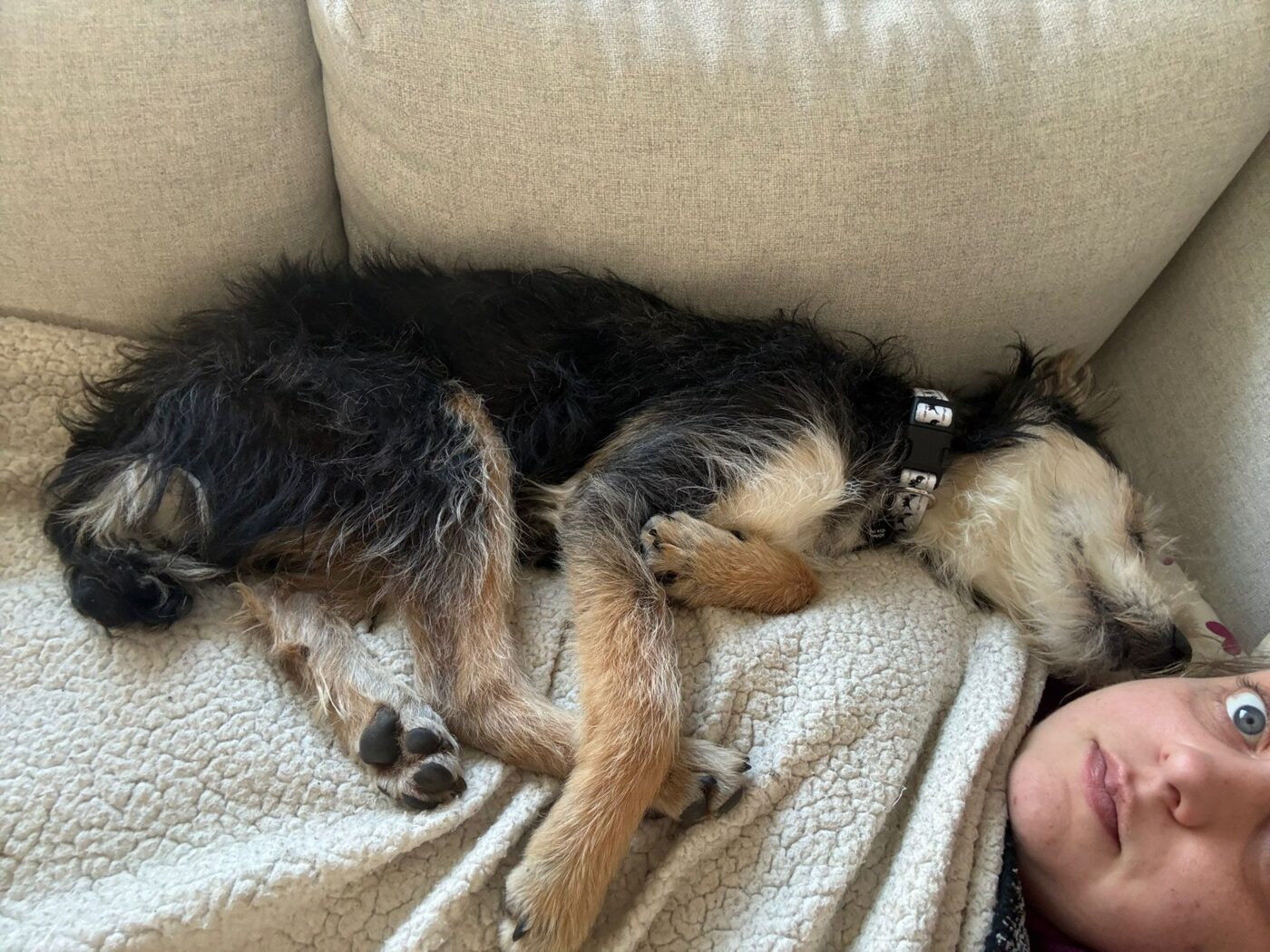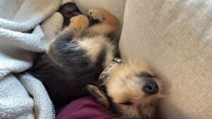 En dat doet hij. Hij ligt heerlijk in het zonnetje, speelt met een hondenvriendje die op bezoek kwam om zich daarna languit op de bank lekker te laten kroelen op zijn buikje. Mica geniet… met volle teugen. Zijn foster noemt hem; “Mica de levensgenieter” en het is een ontzettende kroelkont.