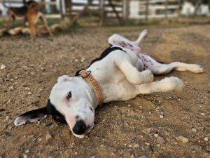 Na haar verhuizing past Milka zich opvallend makkelijk aan. Ze wandelt al keurig mee aan de riem, is sterk gericht op mensen en zoekt vanzelf contact. Ze gaat regelmatig mee de vrijwilligerswoning in, waar ze al rustig leert hoe het is om in een huis te zijn. Dat doet ze heel vanzelfsprekend en ontspannen. Buiten geniet ze van dutjes in de zon en van spelen met haar hondenmaatjes.