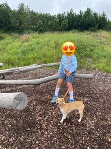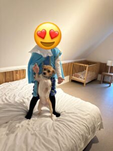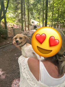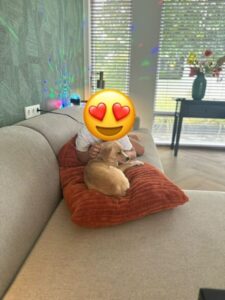 Buiten en in contact met onbekenden wordt haar onzekerheid wat meer zichtbaar. Nieuwe mensen, vooral onbekende kinderen en volwassenen, kunnen haar overprikkelen. In die situaties kan ze blaffen, piepen en zelfs soms uitvallen om afstand te creëren. Dit gedrag komt voort uit spanning en angst… het is geen agressie. Bezoek aan huis is daarom lastig voor haar en vraagt om duidelijke begeleiding en rustmomenten. Gezien het huidige gezin een druk sociaal bestaan heeft met veel bezoek geeft dat dan ook problemen. In de bench voelt ze zich overigens wel veilig en daar kan ze zich dan veilig terugtrekken.