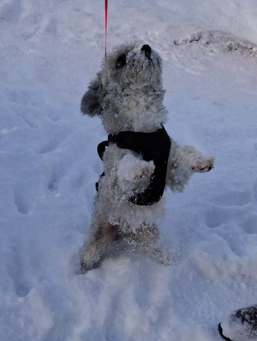 Wandelen vindt hij heerlijk en ondanks dat hij nog wat enthousiast kan zijn aan de lijn, loopt hij voor een jonge hond verassend netjes mee en trekt niet. Hij heeft energie, maar is geen stuiterbal; met één goede niet te korte wandeling en wat spelmomenten is hij tevreden en is hij zijn energie kwijt.