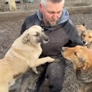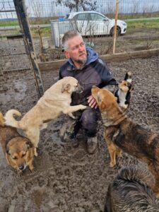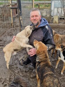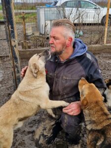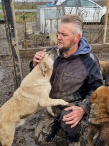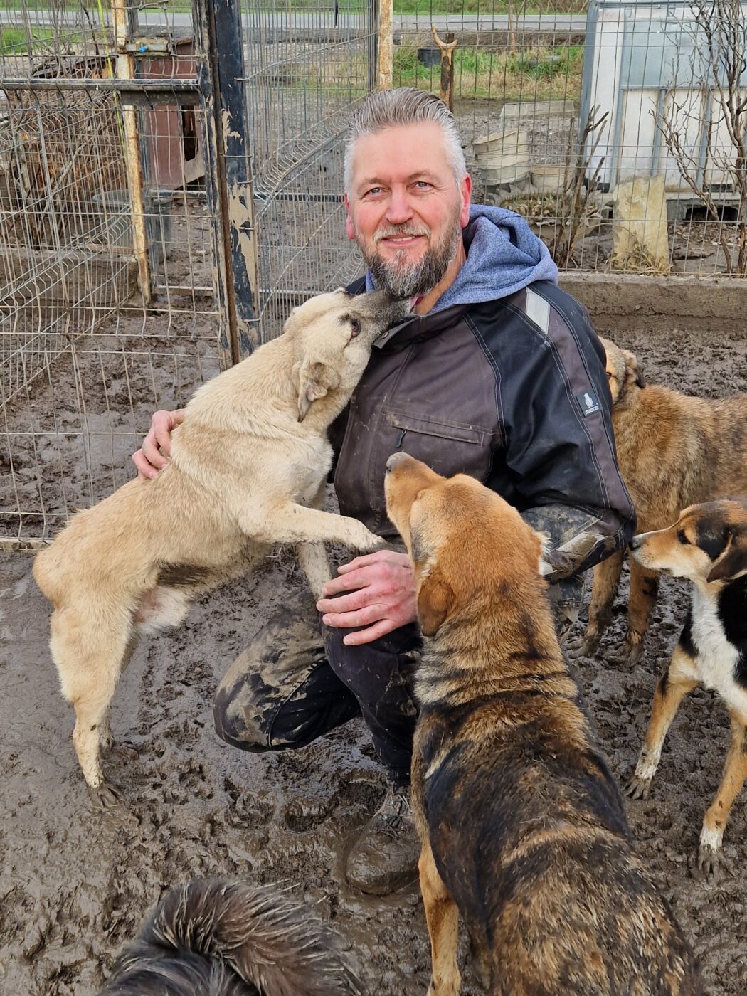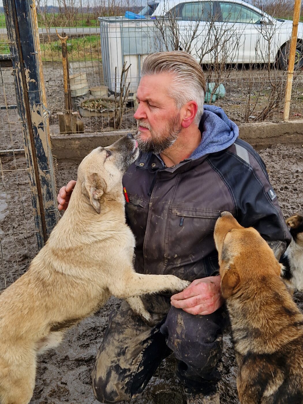 Rudolf is namelijk een enorme aanhankelijke, menslievende hond. Hij leeft voor contact. Hij zoekt geen ruzie, hij doet niet moeilijk. Hij wil maar één ding: dicht bij je zijn. Als de vrijwilligers het terrein opkomen, zie je hem helemaal opleven. Dat zijn zijn geluksmomentjes. Hij weet dan niet hoe snel hij in de buurt moet blijven, hoe dicht hij tegen je aan kan kruipen. Het liefst klimt hij letterlijk bij je op schoot, gewoon om even te voelen dat hij veilig is. Dat iemand hem ziet.
