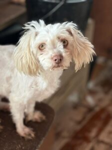 Ze zat haar hele leven opgesloten in een schuur. Geen ruimte, geen aandacht, geen veiligheid. Gewoon overleven. Ze was zwaar verwaarloosd toen ze daar werd weggehaald. Haar vacht was in zo’n slechte staat dat ze geknipt moest worden. Dat groeit weer aan en daaronder zit een prachtig wit, knap meisje.